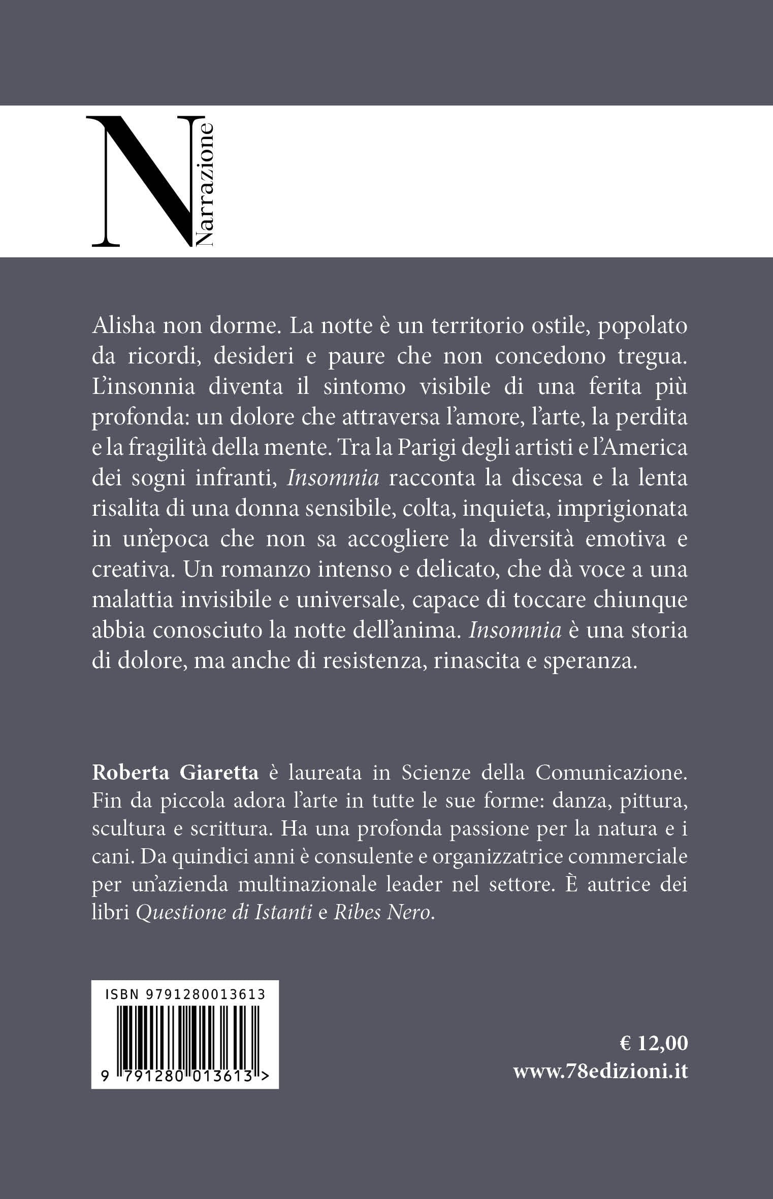 Alisha non dorme. La notte è un territorio ostile, popolato da ricordi, desideri e paure che non concedono tregua. L’insonnia diventa il sintomo visibile di una ferita più profonda: un dolore che attraversa l’amore, l’arte, la perdita e la fragilità della mente. Tra la Parigi degli artisti e l’America dei sogni infranti, Insomnia racconta la discesa e la lenta risalita di una donna sensibile, colta, inquieta, imprigionata in un’epoca che non sa accogliere la diversità emotiva e creativa. Un romanzo intenso e delicato, che dà voce a una malattia invisibile e universale, capace di toccare chiunque abbia conosciuto la notte dell’anima. Insomnia è una storia di dolore, ma anche di resistenza, rinascita e speranza.