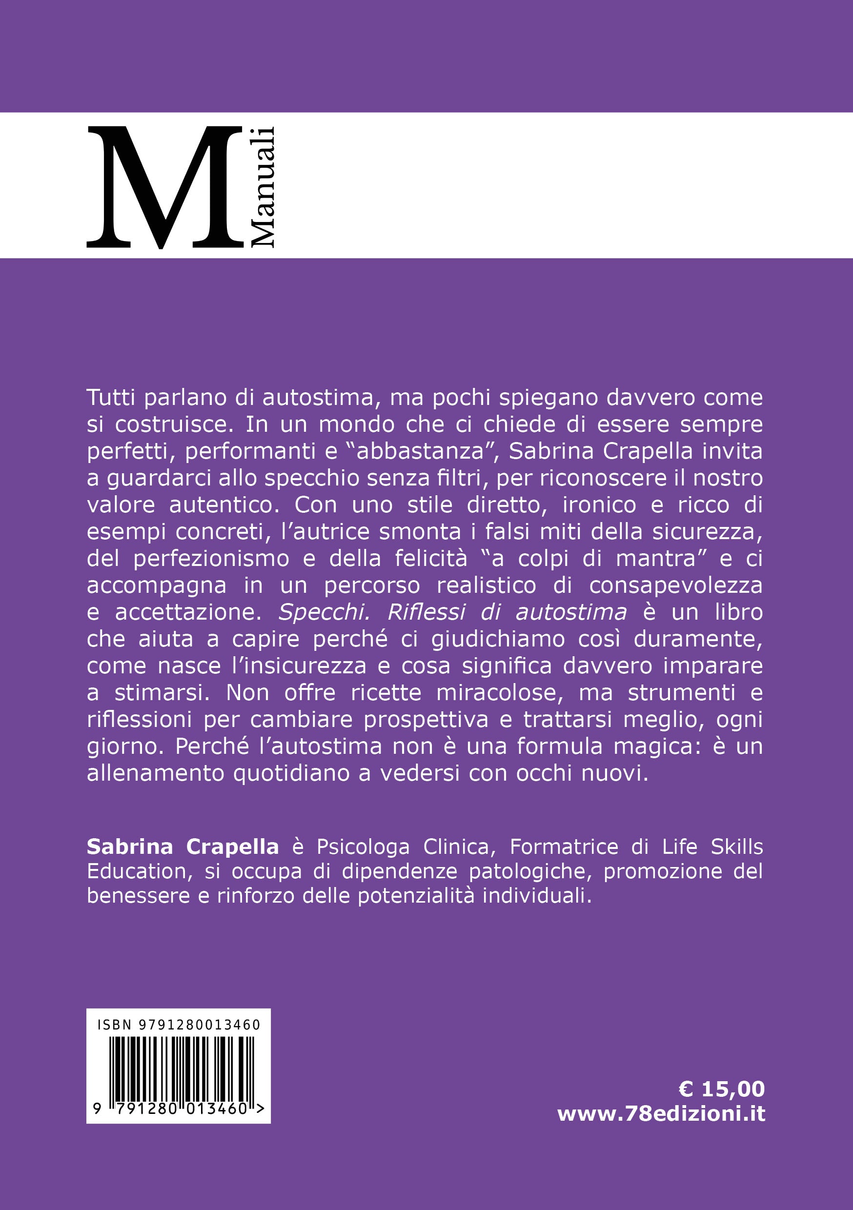 Tutti parlano di autostima, ma pochi spiegano davvero come si costruisce. In un mondo che ci chiede di essere sempre perfetti, performanti e “abbastanza”, Sabrina Crapella invita a guardarci allo specchio senza filtri, per riconoscere il nostro valore autentico. Con uno stile diretto, ironico e ricco di esempi concreti, l’autrice smonta i falsi miti della sicurezza, del perfezionismo e della felicità “a colpi di mantra” e ci accompagna in un percorso realistico di consapevolezza e accettazione. Specchi. Riflessi di autostima è un libro che aiuta a capire perché ci giudichiamo così duramente, come nasce l’insicurezza e cosa significa davvero imparare a stimarsi. Non offre ricette miracolose, ma strumenti e riflessioni per cambiare prospettiva e trattarsi meglio, ogni giorno. Perché l’autostima non è una formula magica: è un allenamento quotidiano a vedersi con occhi nuovi.
